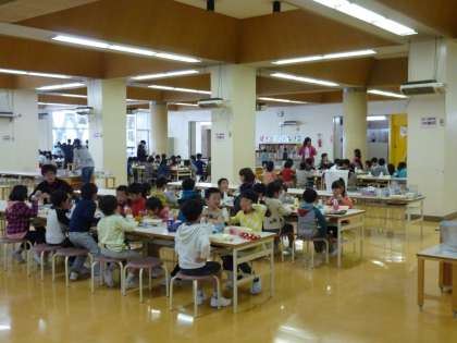 全校児童が一緒に給食をいただきます。今日の献立は、ビビンバ・トック・まめこんぶでした。給食のルールにしたがって、残さずにいただきましょう。