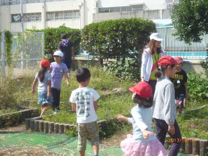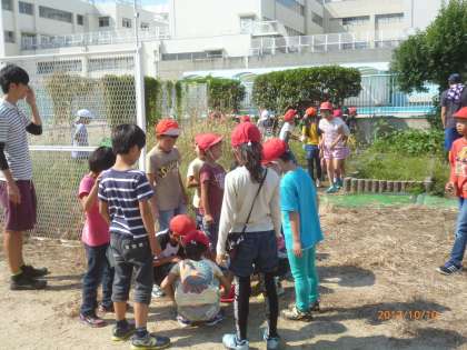 これまで、3年生は学習園でよく虫とりをしています。1年生にやさしく教えることができたかな。