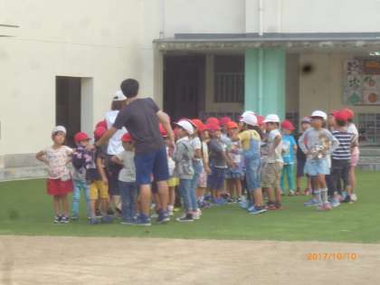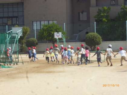 20分休み。矢田北芝生広場に1年生と3年生が集まっています。何をするのかな。