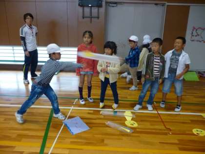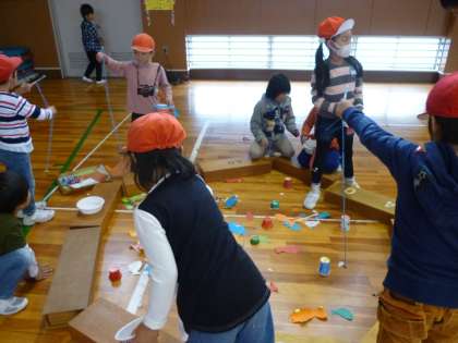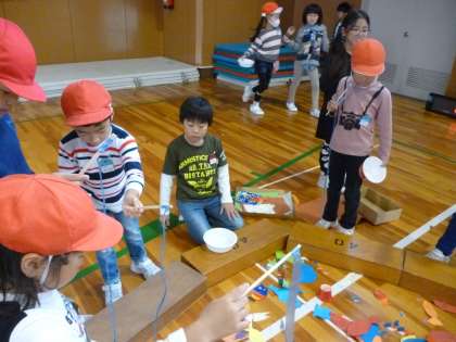 2年生が作ったおもちゃで、1年生が遊んでいるようです。