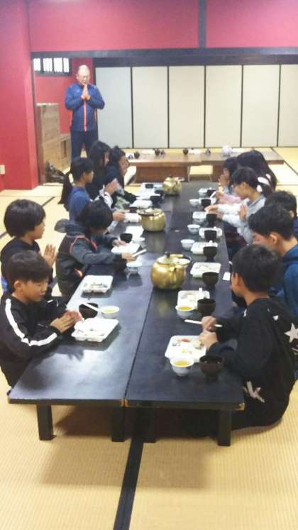 朝の会と朝食の様子です。全員元気です。