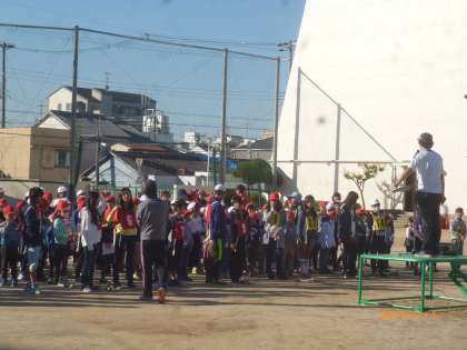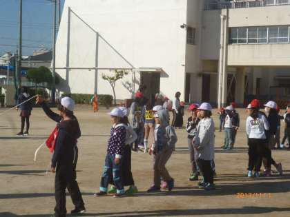 児童集会の様子です。なかよし班で長縄跳びをしました。