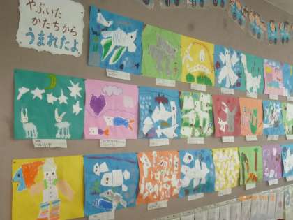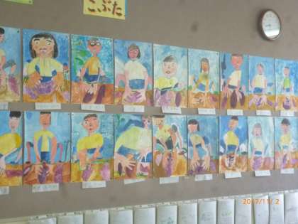 1年生と2年生の教室掲示です。2年生は、先日の「おいもほり」の様子を描きました。
