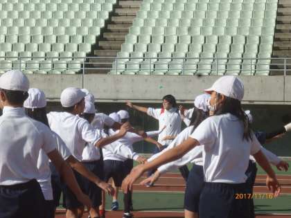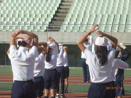 晴天のもと、東住吉区内の小学校10校が、長居スタジアムに集まり、スポーツ交歓会を行っています。