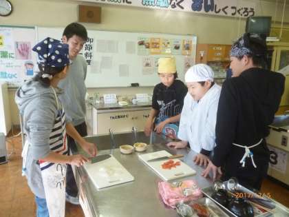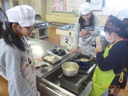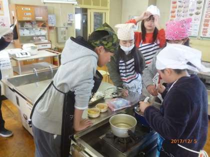 本日の第1校時、6年生が調理室で「お雑煮づくり」をしていました。お味噌とおすまし仕立ての2種類のお雑煮を作っていました。