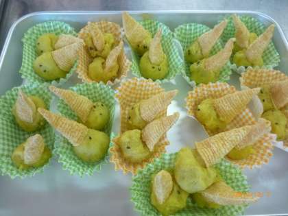 とんがり帽子に丸めたおいも、ゴマの目をつけ、サンタさん。