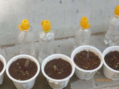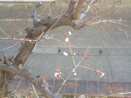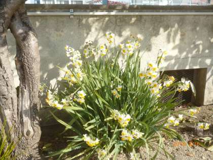 運動場のスイセンが咲き誇っています。ウメはちらほら。1年生のチューリップ。早く咲きますように。
