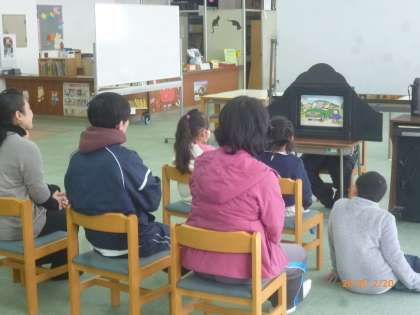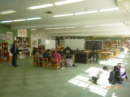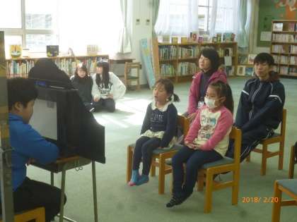 お昼休みに、6年生のおにいさんが、絵本の読み聞かせをしている様子です。