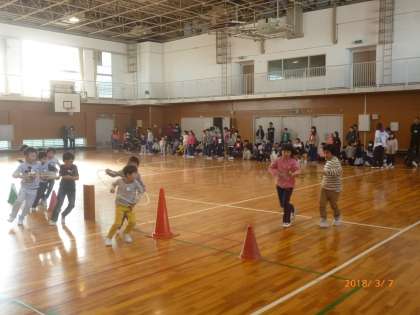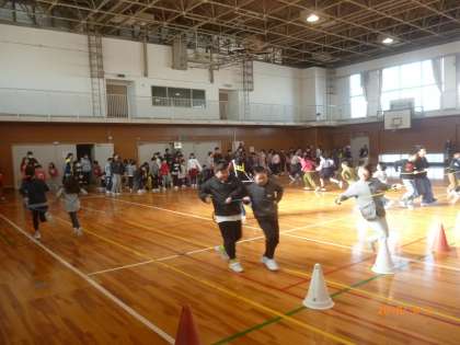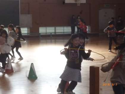 朝の児童集会の様子です。みんなでフラフープリレーをしました。