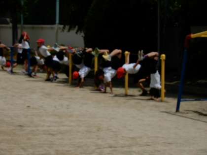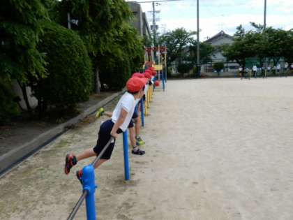 まずは固定遊具を使って準備運動を行ったあと、「つばめ」や「こうもり」などの技に挑戦しました。