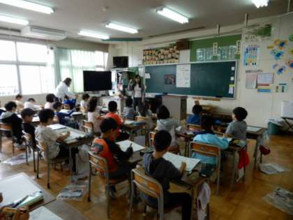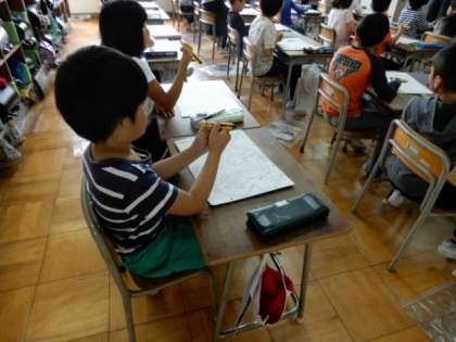 工作用紙に描いた模様をカッターで切り抜くために、まずはカッターの使い方について学習しました。みんな真剣な眼差しでした。