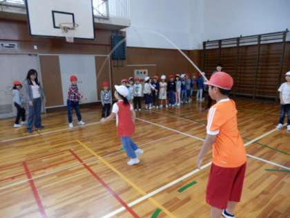今日のめあては、「体をつかって、リズムをとろう」です。縄の動きに合わせて入るタイミングをとりました。