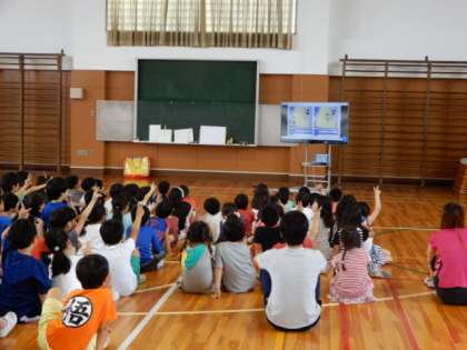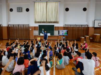 前日の雨の影響で運動場で実施できなくなったので、体育館での実施となりました。
