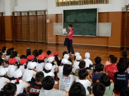 担当者からは、校外で不審者と遭遇した時の対処の仕方として、「い・か・の・お・す・し」について話をしました。