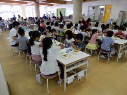 6月14日(木)の給食は、「入学おめでとう給食」として、2年以上の学級にそれぞれ1年生を招待して給食交流をしました。