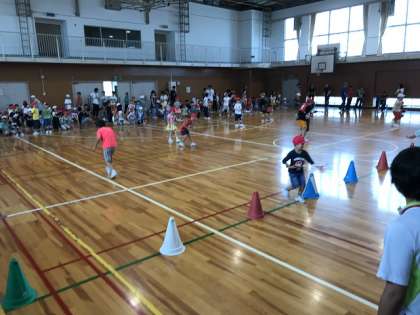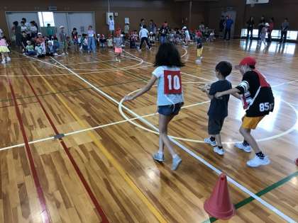 慣れない1年生に高学年が付き添うなど、班で協力して楽しくリレーができました。