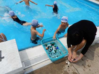 3・4年生は、水中おにごっこや学年対抗石拾いをしました。