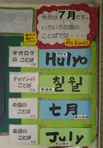 下は、7月をそれぞれタガログ語、ハングル、中国語、英語で表しています。