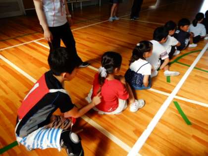 縦割り班が一列に並んで順番に背中に文字を書いて伝えていきます。
