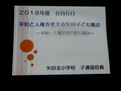 8月6日(月)の午後から矢田中、矢田東小、矢田北小、矢田西中、矢田西省、やたなか小中一貫校の児童・生徒の代表がやたなか小中一貫校に集まって、「平和と人権を考える矢田子どもの集会」を開催しました。
