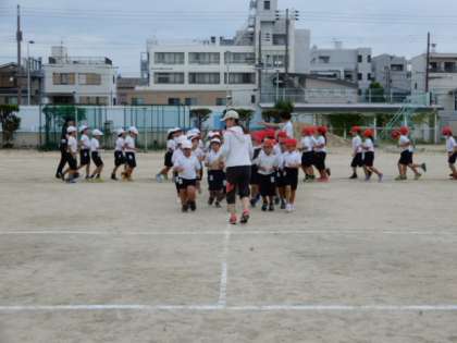 2枚目の写真は、1・2年団体競技「綱引き」の退場の練習です。