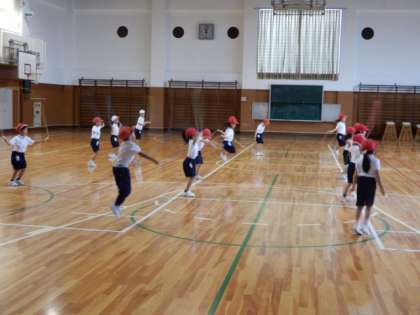 1年は、なわとびを調子よく跳べるように練習をしています。