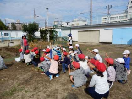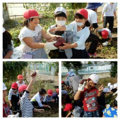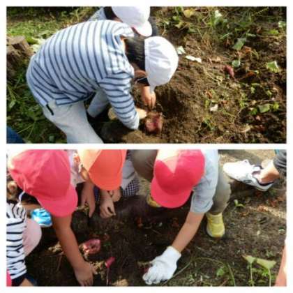 学習園の土を掘りおこすと、大小たくさんのさつまいもがごろごろ出てきて子どもたちは大興奮でした。