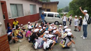 高丸山に登ったあと、カモフラージュゲームとブランコ遊びをして、午後4時8分宿舎到着しました。さきほど、開舎式が終わり、これから宿舎にはいるところです。全員元気です。