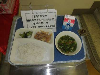 内容は、豚肉のコチジャン炒め、もずくスープ、ブロッコリーのナムル風あえもの、ご飯、牛乳です。