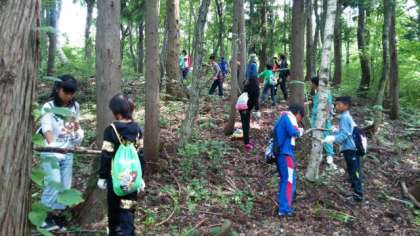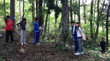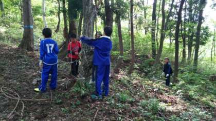 宿舎裏の森で、オブジェづくりをしています。どんなものができるのか楽しみです。