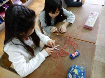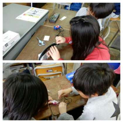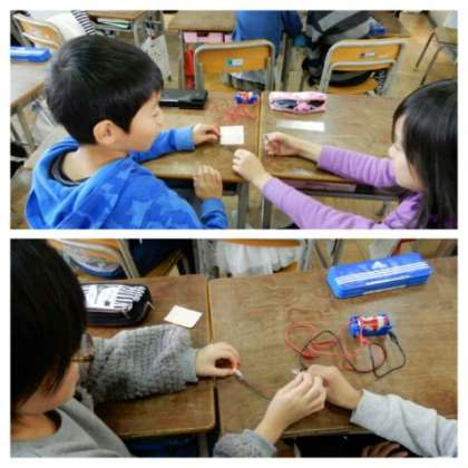 乾電池と豆電球の間にアルミニウムやクリップ、紙などいろいろなものをはさんで、明かりがつくかどうか実験で確かめました。