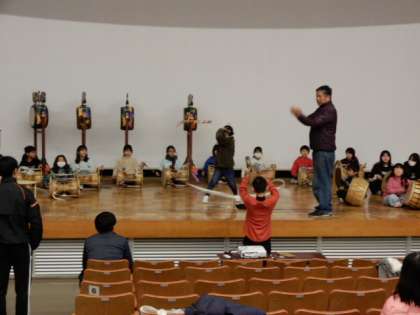 1月25日(金)の民族学級発表会が間近に迫り、発表会の練習も本番と同じ講堂で行いました。サムルノリの合奏は、みんなの息が合い迫力ある演奏になっています。また、サンモという帽子に付けた長いひもも上手に回せるようになってきました。