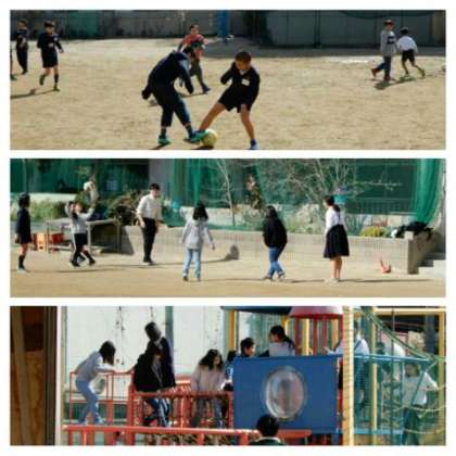 お昼のお弁当をグループで一緒に食べたあと、運動場でサッカーやバレーボール、固定遊具で仲良く遊びました。