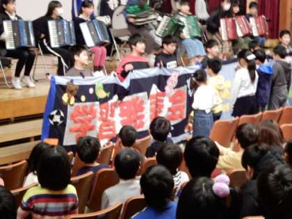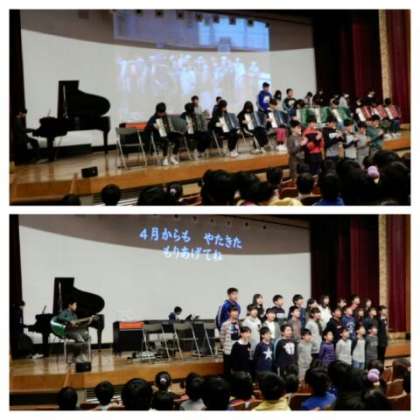 教職員からの合奏のプレゼントのあと、6年生から在校生へのプレゼント渡しとお礼の合奏を披露しました。