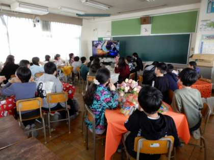 3月15日(金)に6年は、卒業茶話会でお茶菓子をいただきながら、小学校の修学旅行や学習発表会などの思い出のビデオを見て楽しみました。