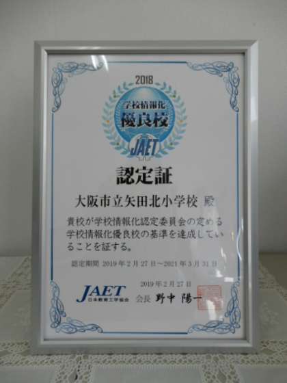 2019年2月27日付で、日本教育工学協会より「学校情報化優良校」に認定され、認定証が送られてきました。