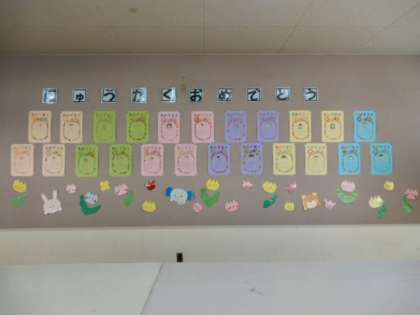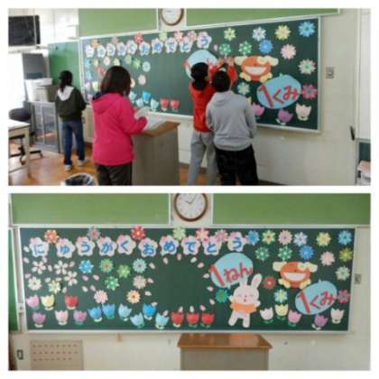 入学式の式場の講堂はもちろん、1年生の教室や廊下を掃除してきれいに飾りつけもしました。新入生を迎える準備は万端です。