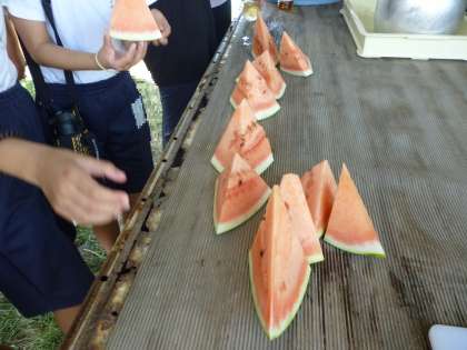 魚つかみ、焼き板洗いのあと、すいかのおやつをいただきました。冷たくて、とてもおいしかったです。種飛ばしをしている子どもたちもいました!!