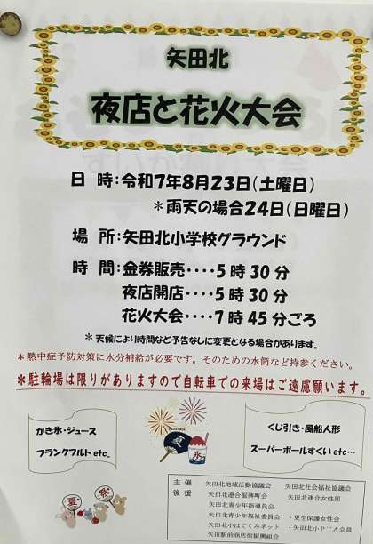 矢田北地域活動協議会・矢田北社会福祉協議会主催の「夜店と花火大会」が8月23日(土)に矢田北小学校グラウンドで開催されます。