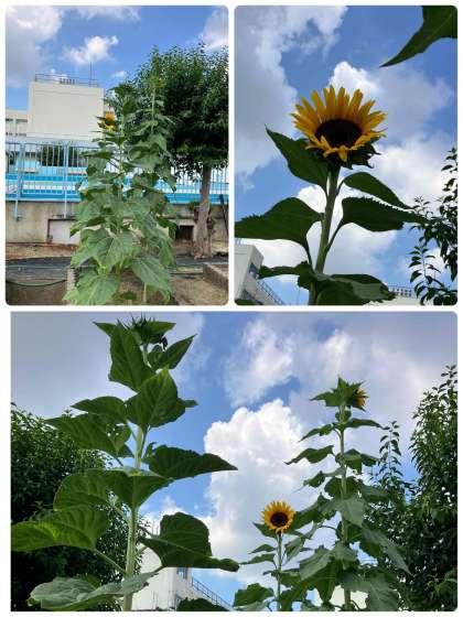 1年生の育てている「ひまわり」の花が咲きました!!大空に向かって大きく成長しています!!