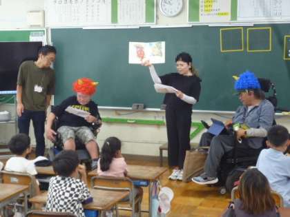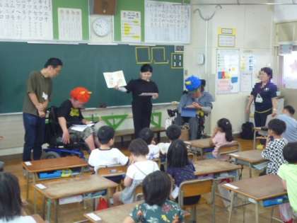 NPO法人「赤おに作業所」の方との交流がありました。赤おに作業所の設立の起源となったお話「泣いたあかおに」の絵本を劇で演じていただきました。担任の先生も途中で村人役として出演し、大変盛り上がりました。(8月29日 記事)
