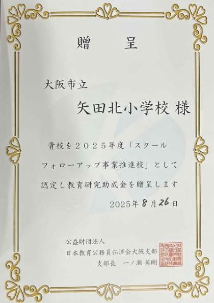 2025年度スクールファローアップ事業推進校として、日本教育公務員弘済会大阪支部より、教育研究助成金をいただきました。子どもたちの学びの充実のために活用させていただきます。ありがとうございました!!