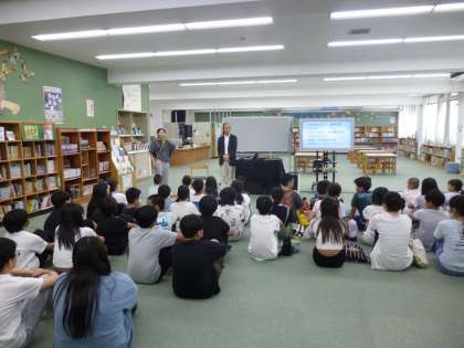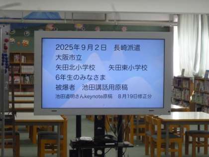 本日長崎より、被爆体験伝承者の方が来てくださいました。本校6年生と矢田東小学校6年生が実際にナガサキで被爆された方の実話を伝承者の方が伝える形でお話を聞きました。