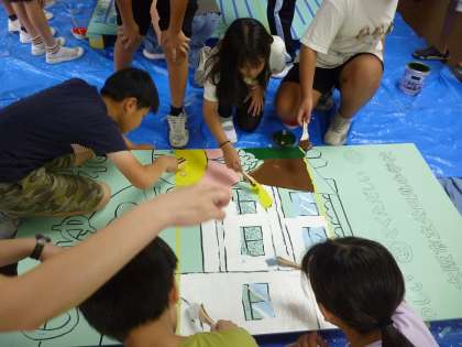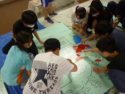 50周年を記念して、投てき板を制作しています。各学年で分担してペンキで色塗りをしました。素敵な作品が完成しそうです。