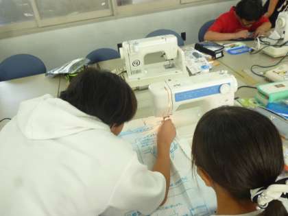 ミシンは上糸と下糸を針に通すのが少し難しいですね。みんなで協力して頑張っています。