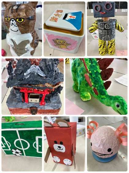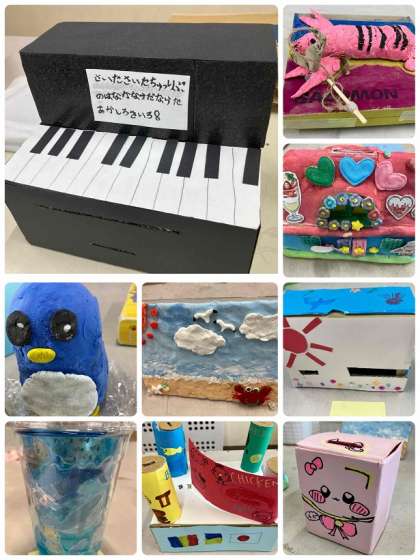 教室の後ろには、たくさんのアイデア貯金箱が展示されています。今年の作品も力作です。お金もたくさんたまりそうです。