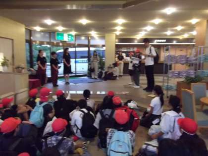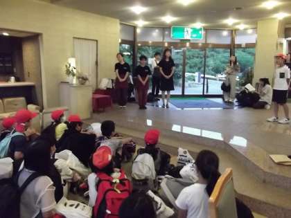 開舎式を行い、ホテルの方に挨拶をしました。今日からお世話になります。部屋割りの後、避難訓練で避難経路の確認をしました。食事まで部屋でくつろいでいます。