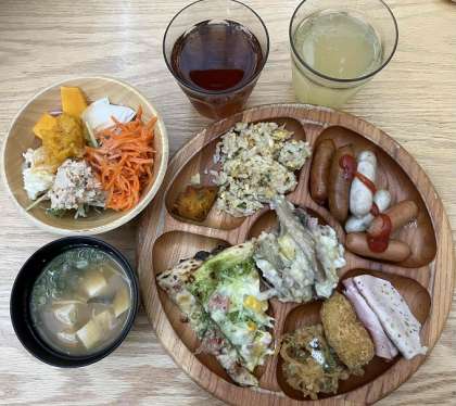 昼食は、バイキングです。ソーセージやピザ等、子どもたちはそれぞれ好きな食材を選んで食べていました。