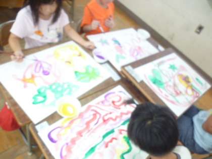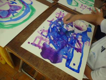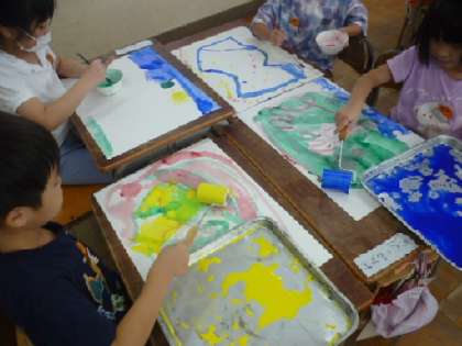 図画工作の授業で絵の具を使って画用紙に筆やローラーで絵を描きました。