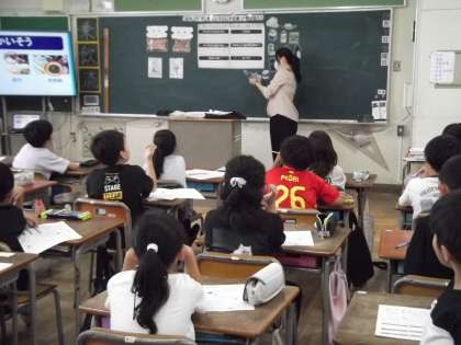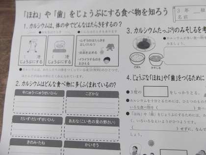 3年生の栄養学習の時間です。地域の栄養教諭が本校まで来て、授業をしています。テーマは『ほねや歯をじょうぶにする食べ物をしろう』です。カルシウムの多い食べ物を頑張って食べていきましょうね。